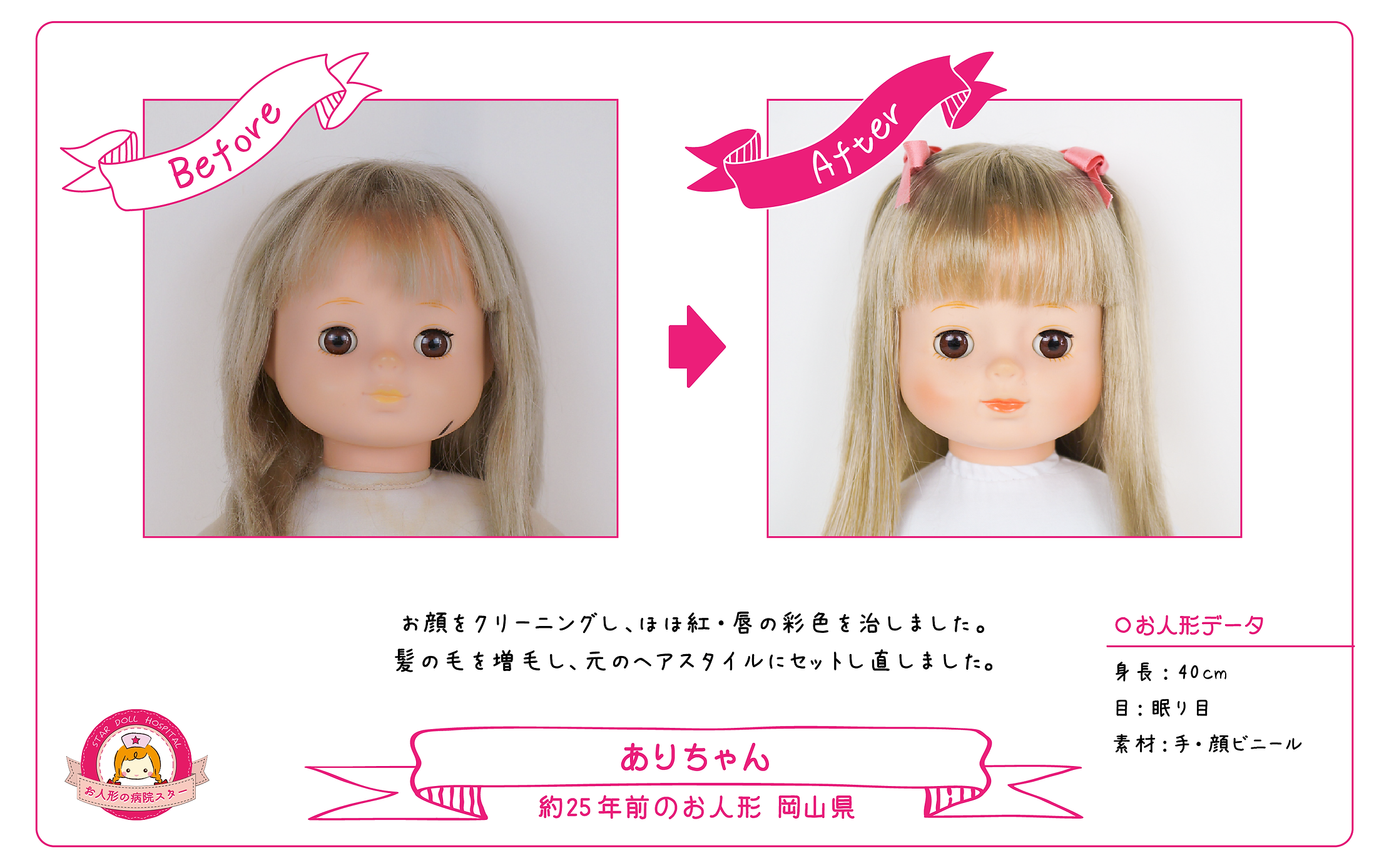 お顔をクリーニングし、ほほ紅・唇の彩色を治しました。