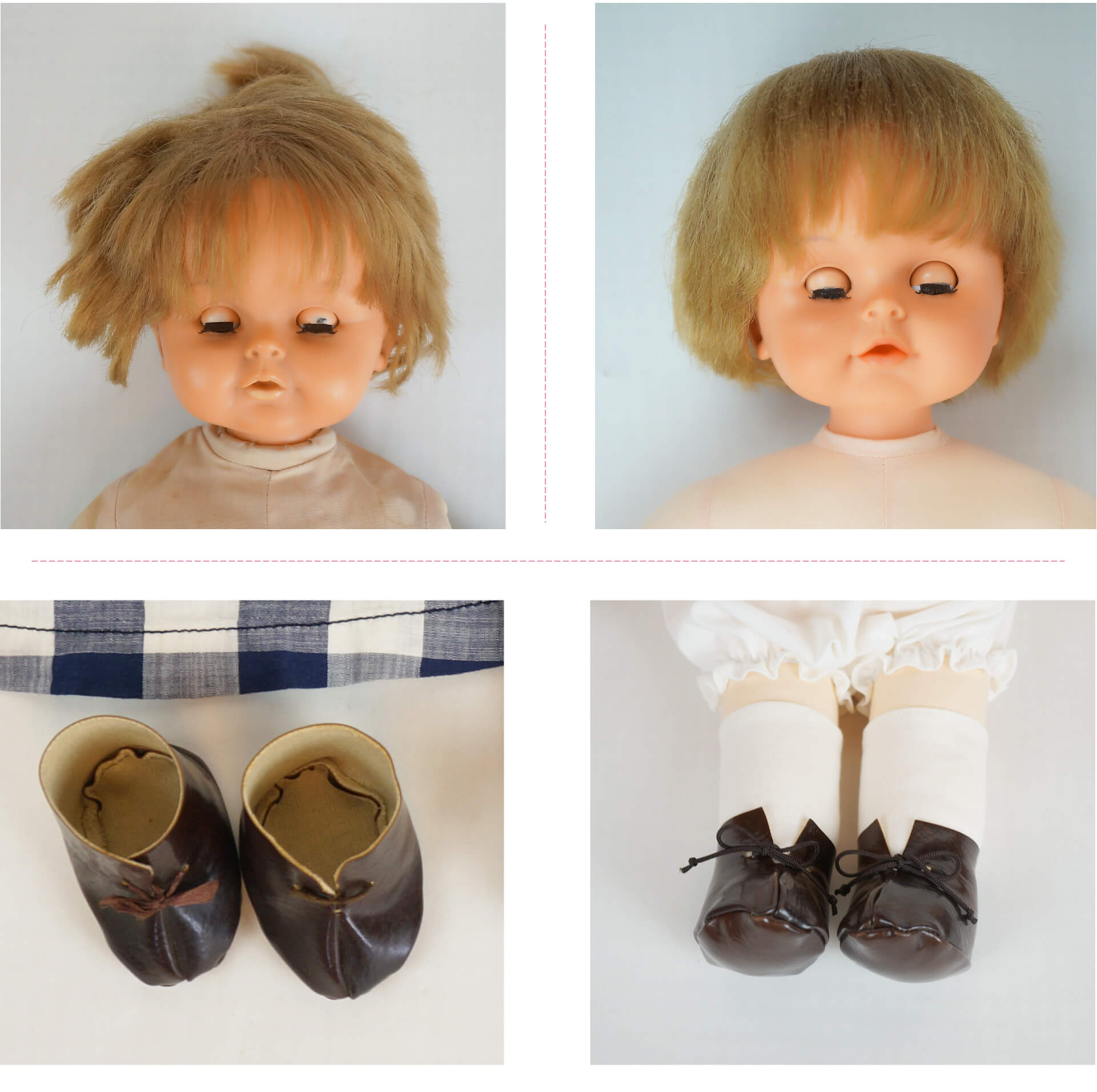 *全身クリーニング *髪の毛のシャンプー *ボディの作り直し(お顔と手の色に合わせる) *お顔の彩色直し *目の治療及び瞼の塗り直し *退院セット+オプション(ボンネット・エプロン) *お靴は元のお靴をクリーニング・補修