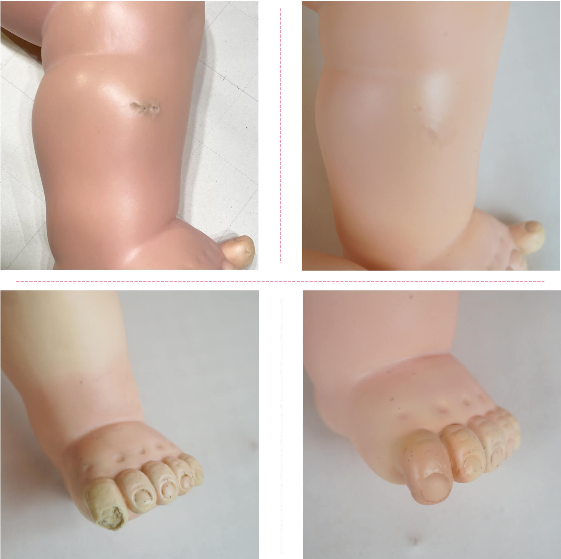 *お顔・手足ソフトビニール部分のクリーニング *お顔の彩色直し *髪の毛のシャンプー *前髪の増毛&セット *ボディの作り直し *足の親指欠損・治療 *すねの皮膚傷・治療