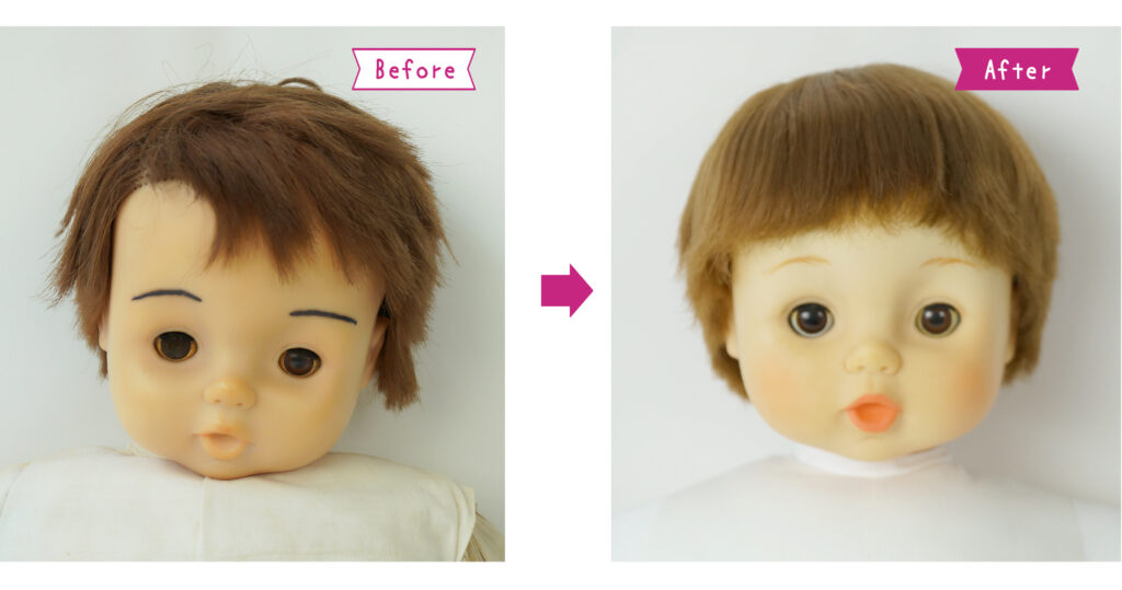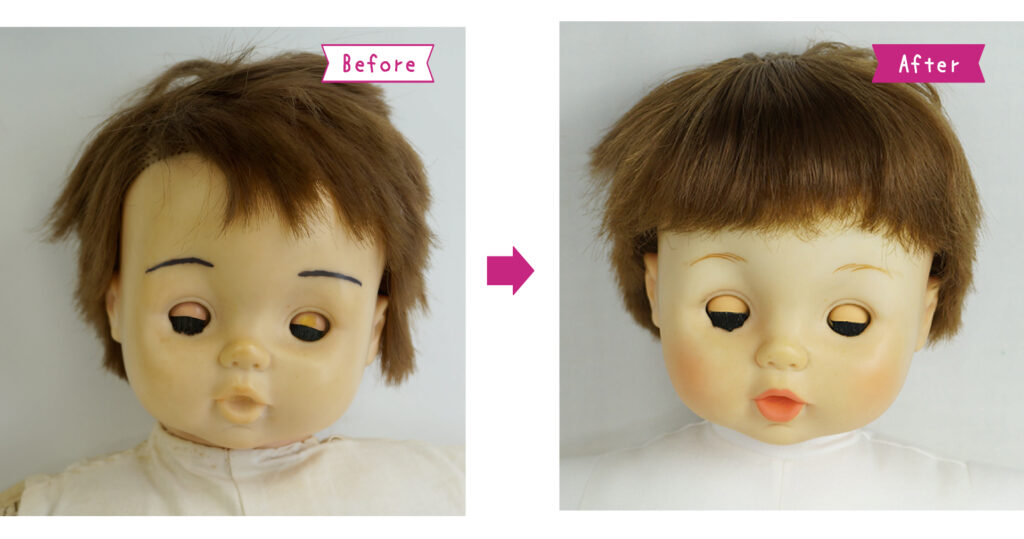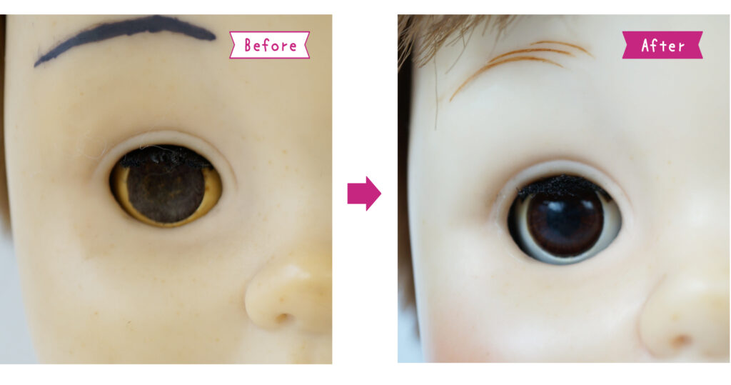 まゆ毛が黒いインクで描いてあったので、「シミケア」(*1)で除去し、新たに描きなおしました。