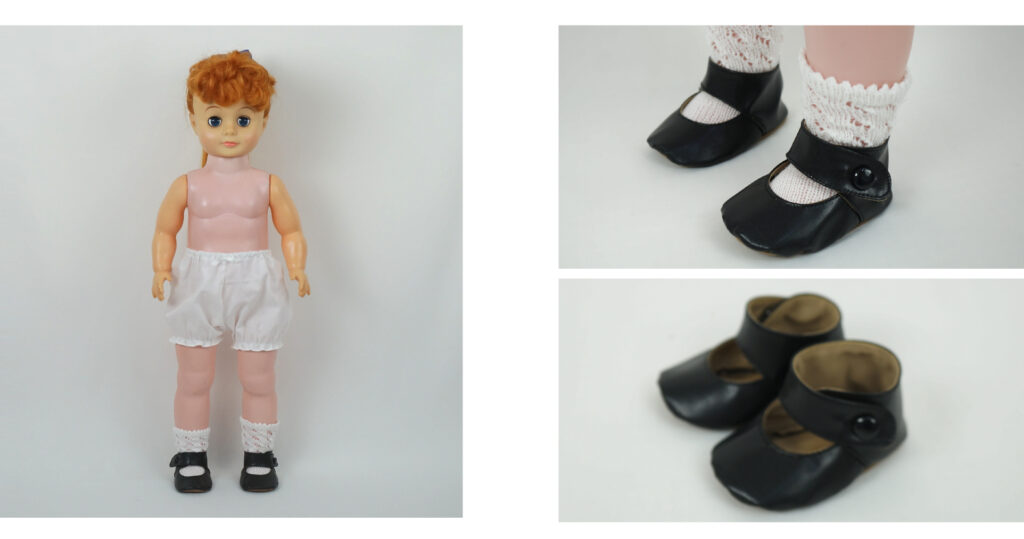 おにんぎょうさんの足にフィットする靴を合皮で作りました。