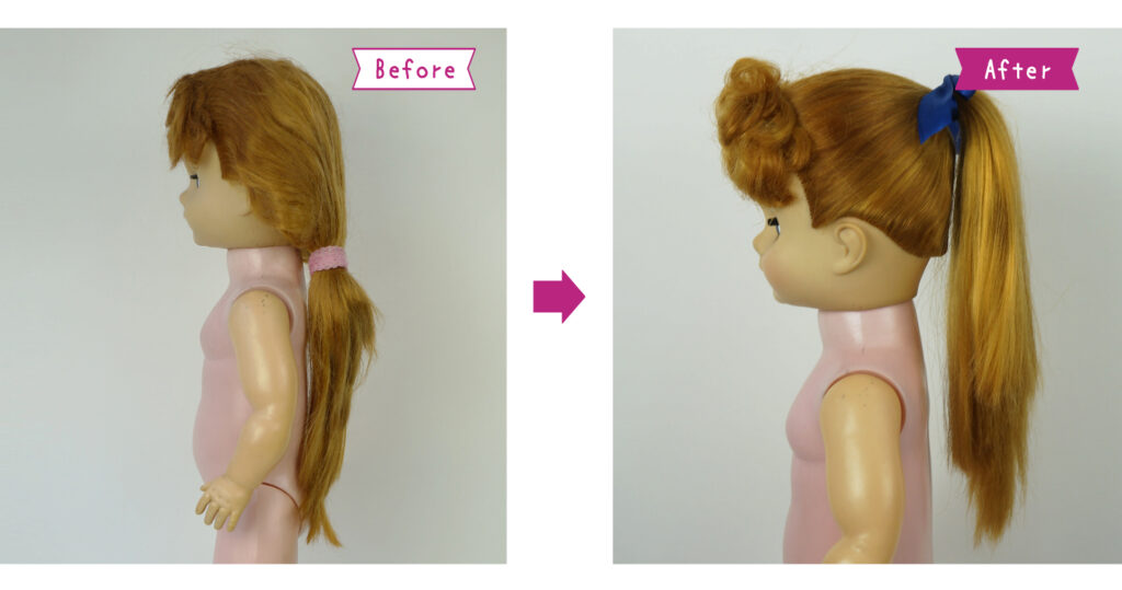前髪をカールし、後ろはストレートにしてポニーテールにまとめました。