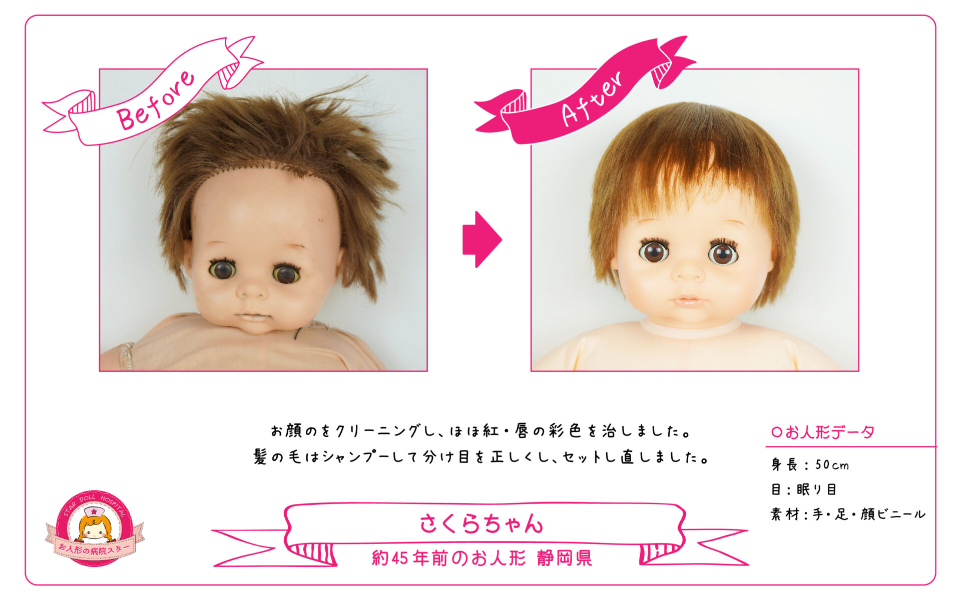 お顔のクリーニングをし、ほほ紅・唇の彩色を治しました。