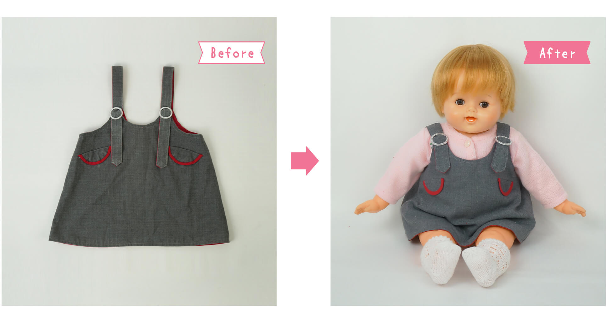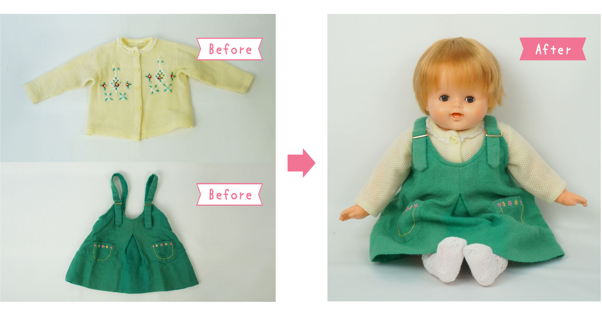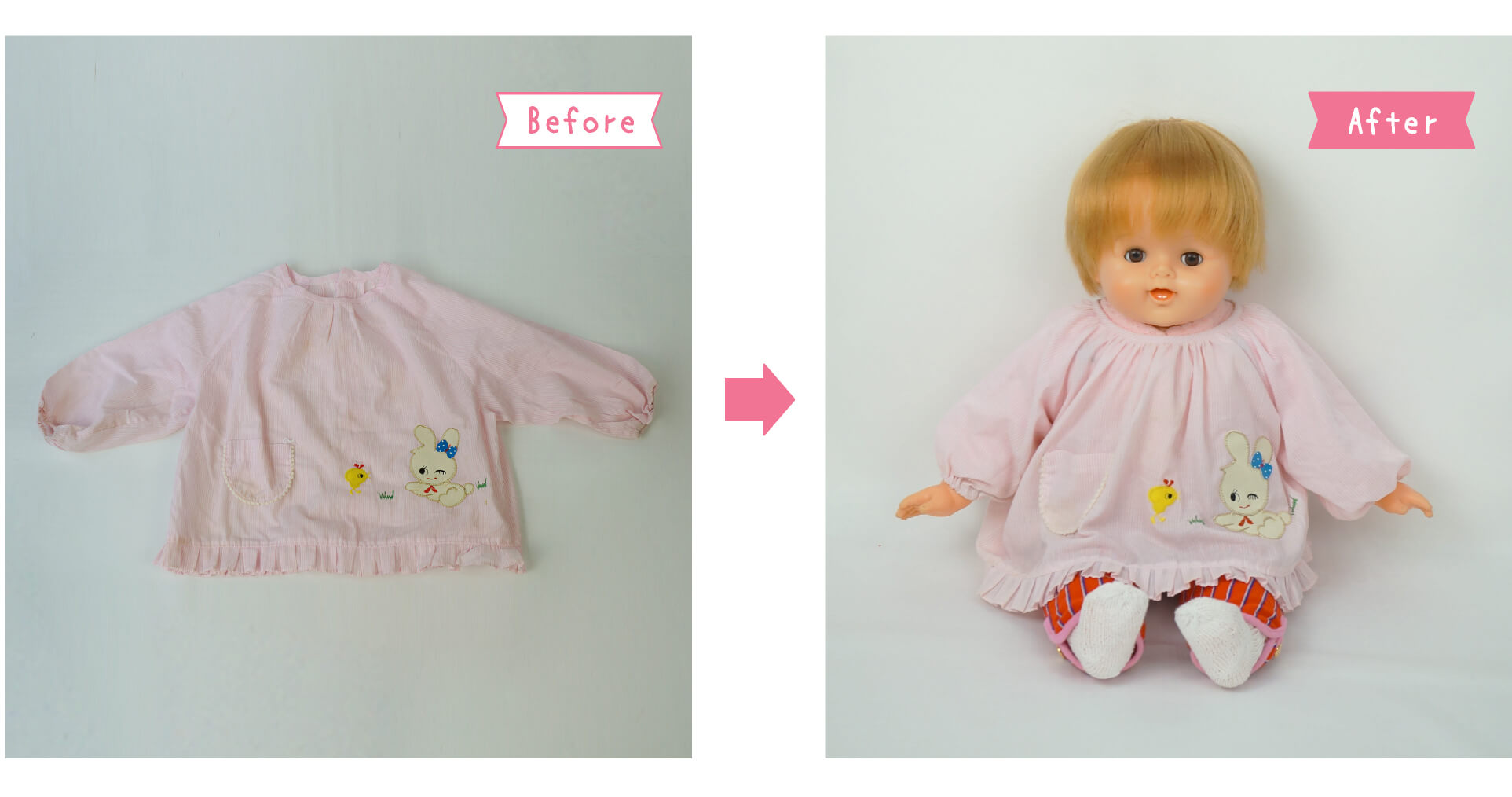 保護者さまがご幼少の頃のお洋服をデザインをそのままに、約60%小さくしてしのちゃんのお洋服にリフォームしました。