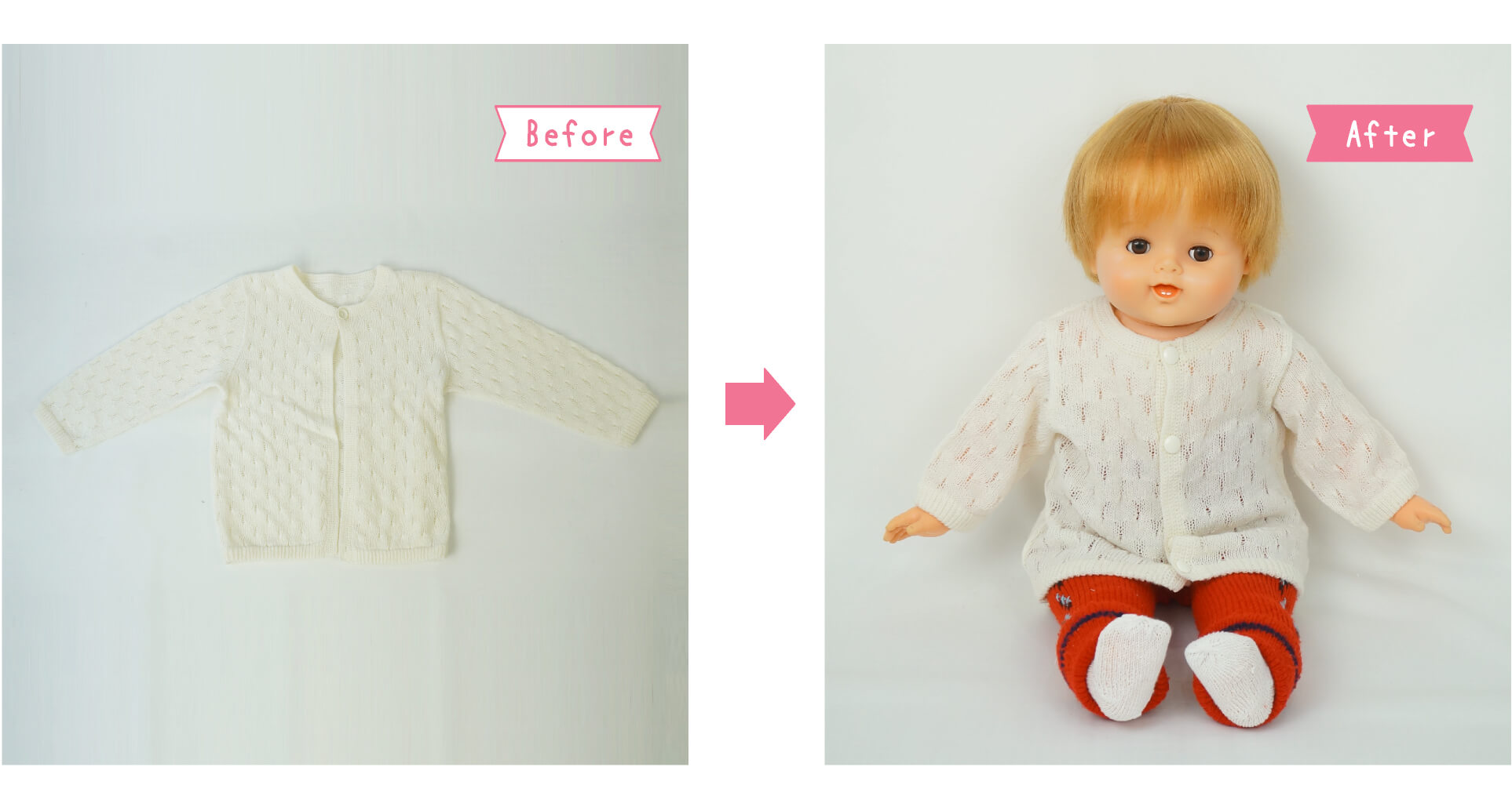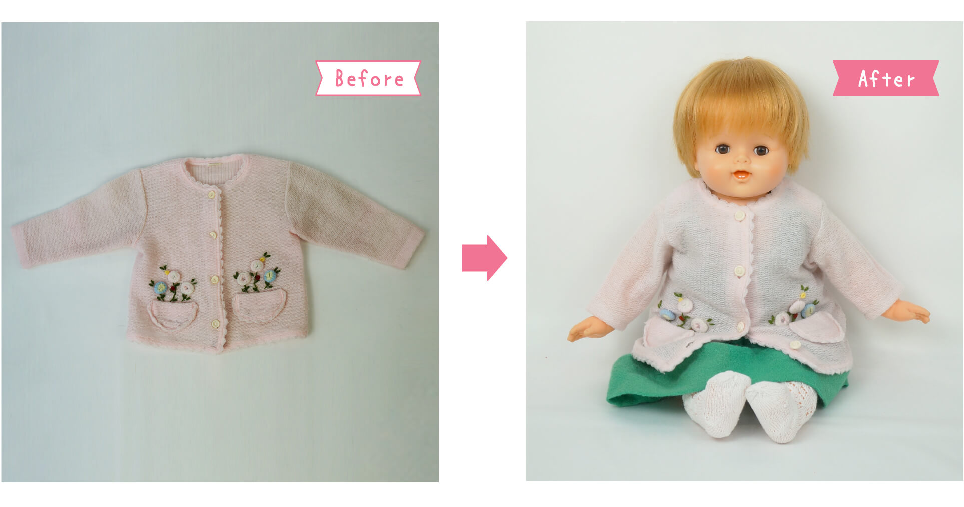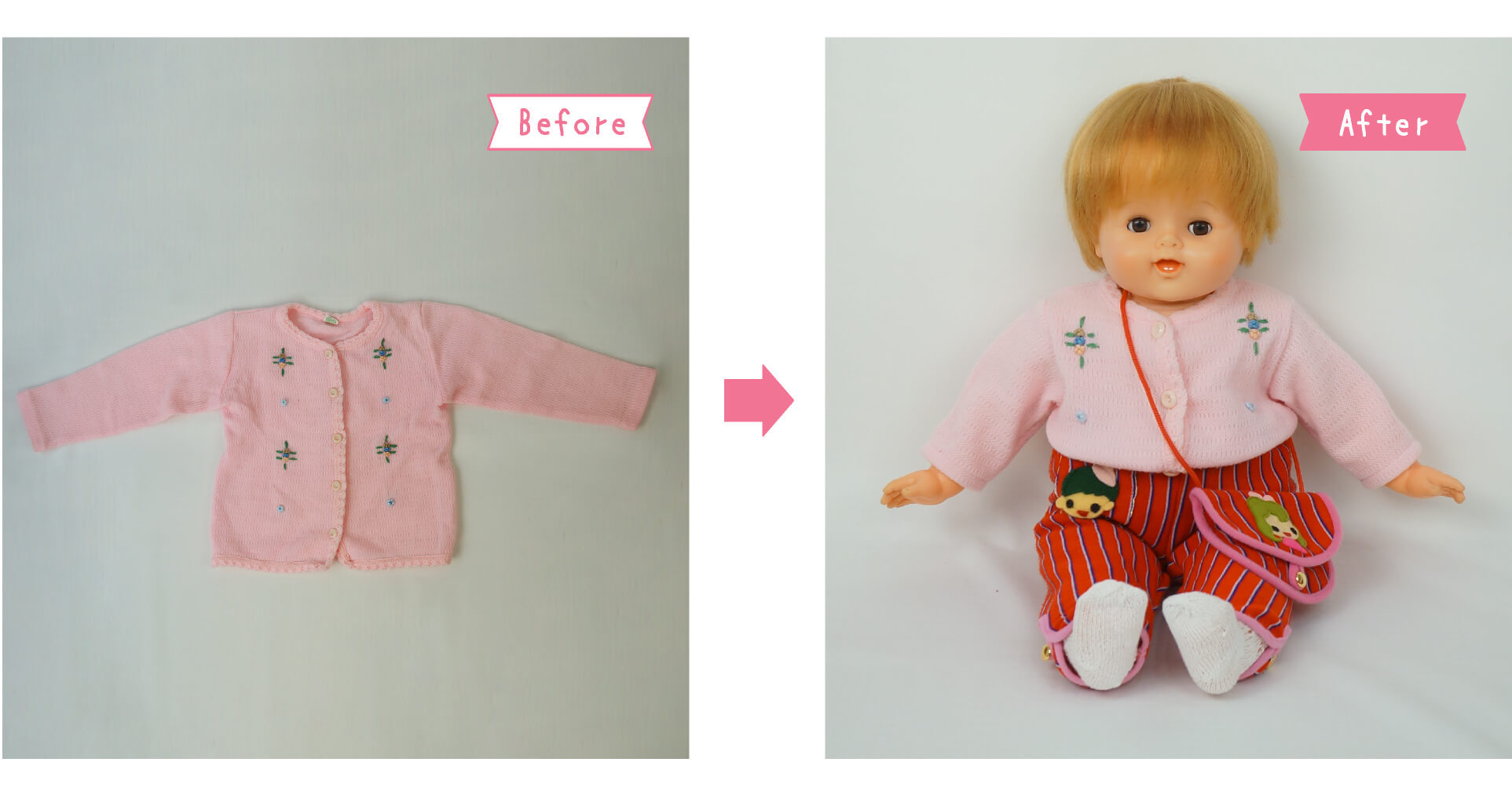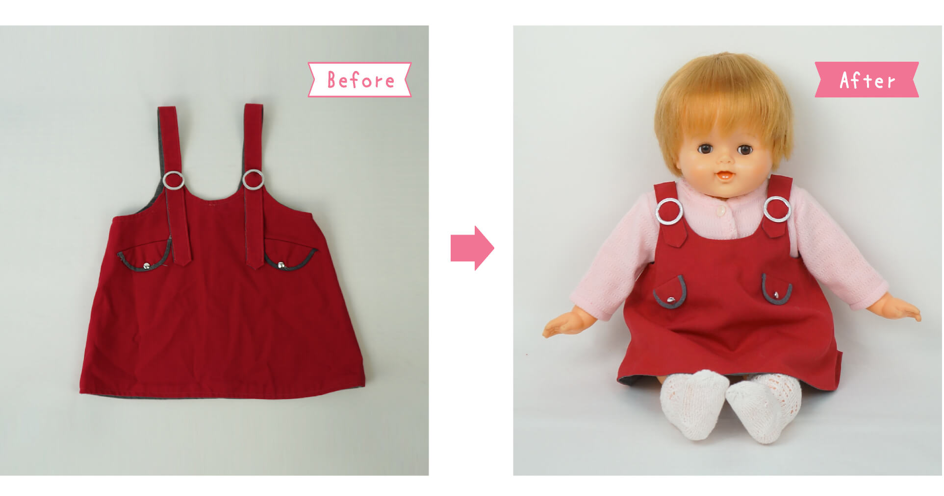 保護者さまがご幼少の頃のお洋服をデザインをそのままに、約60%小さくしてしのちゃんのお洋服にリフォームしました。